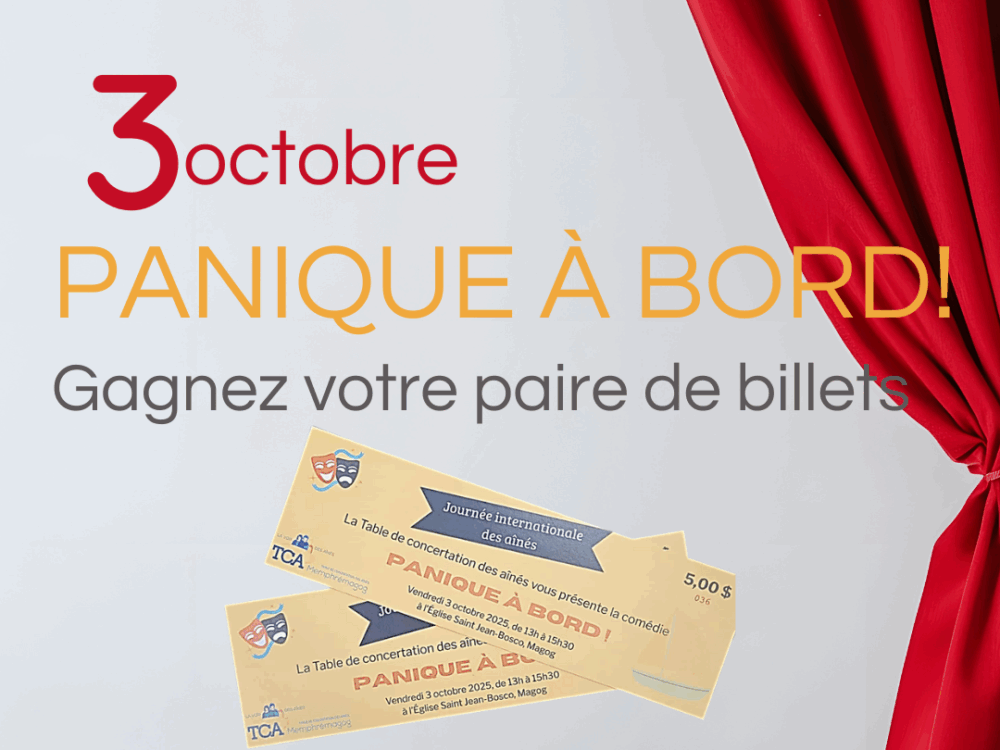 Vous avez envie de rire et de passer un bon moment ? Han-Droits fait tirer 3 paires de billets pour le spectacle « Panique à bord ! » Un spectacle présenté par la Table de concertation des aînés Memphrémagog - TCAM. Quand: le 3 octobre de 13h à 15h30 Où:…